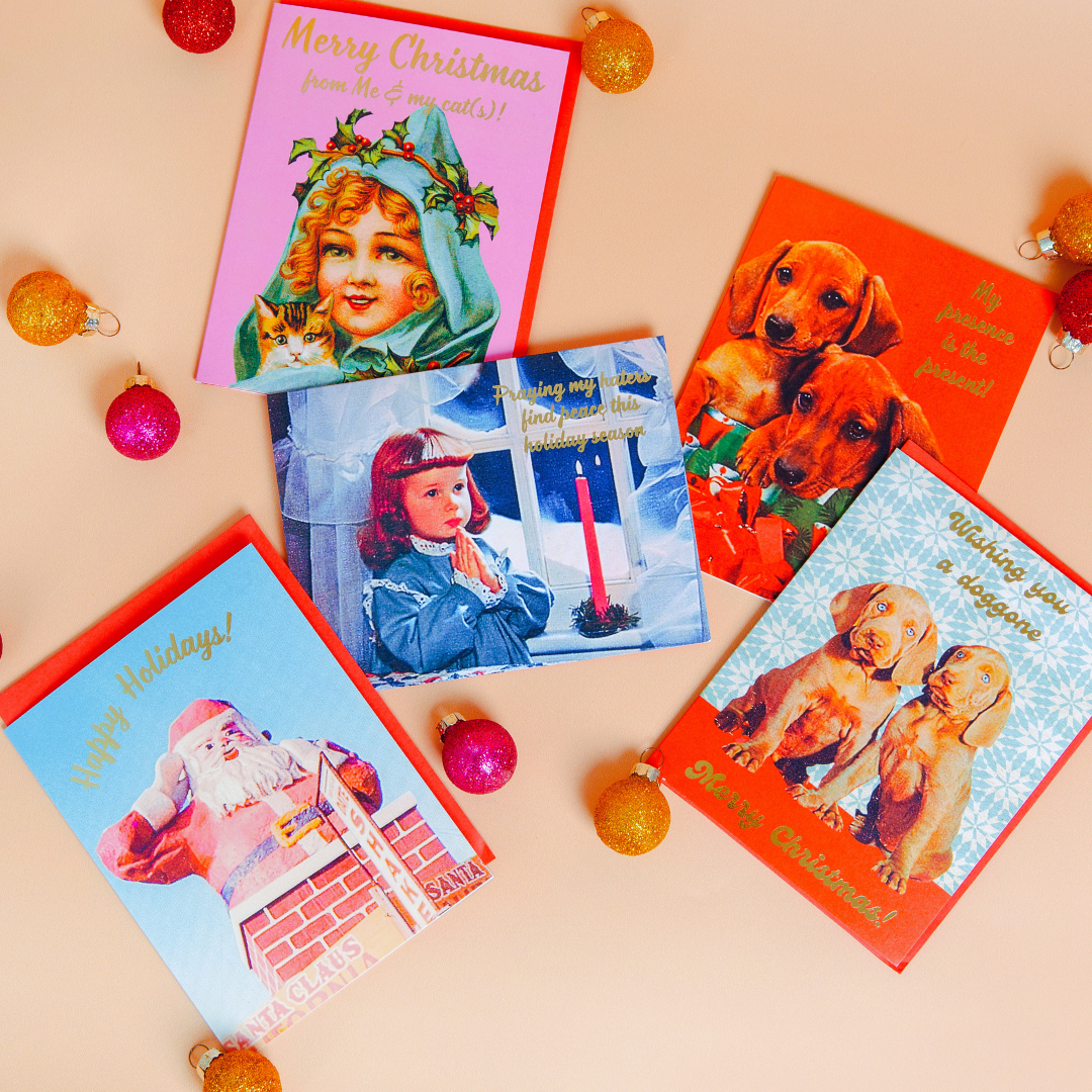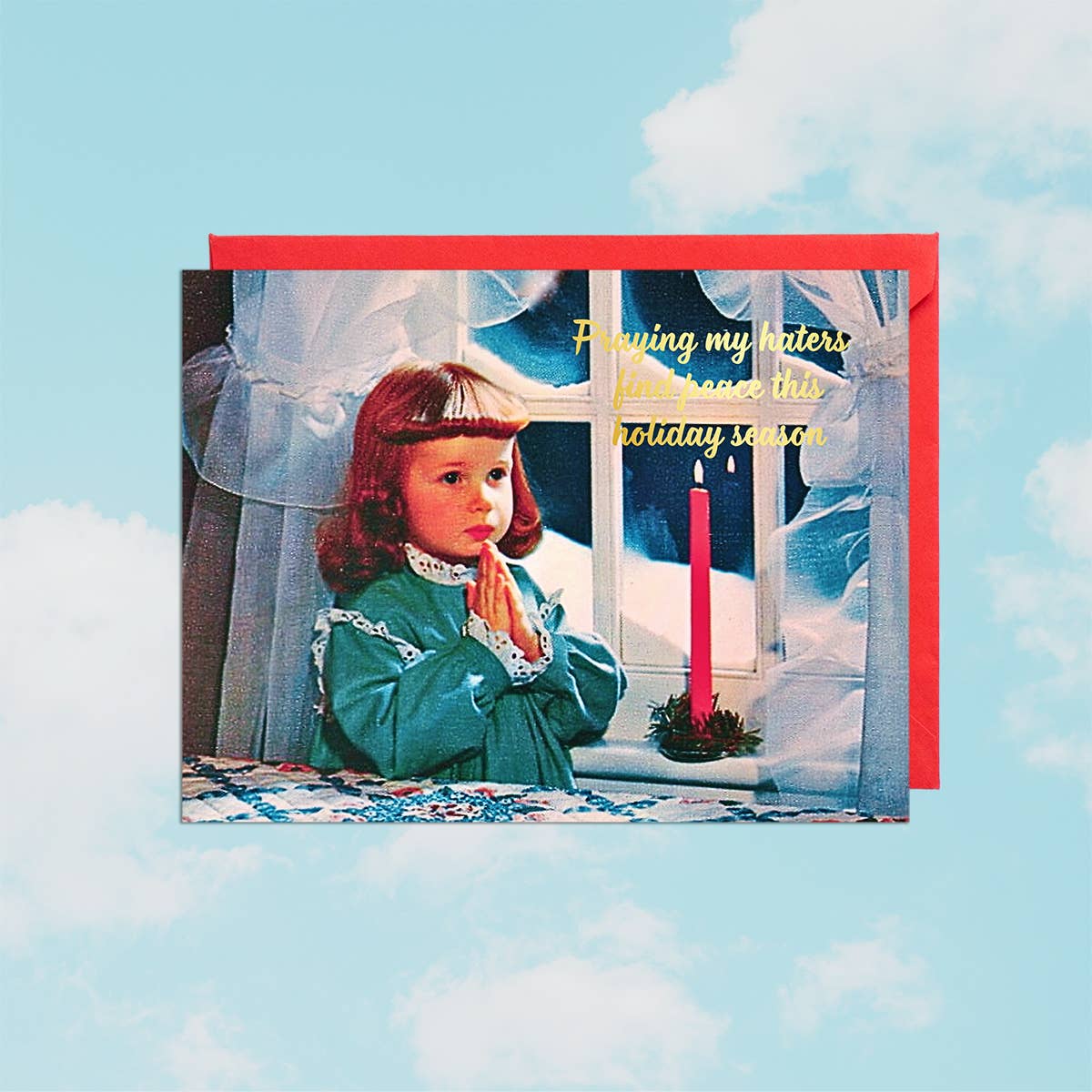 • A2 size: 4.25" x 5.5" • Printed on matte white cardstock• Gold foil detailing• Blank inside for your own message• Includes a red peel...